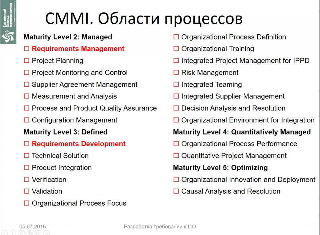 В первых редакциях уровни, как и положено у программистов начинались с 0, но с появлением новых редакций нумерация уровней перешла на классическую нумерацию от 1 до 5. В рассмотрении модели будем фокусироваться на качественной характеристике уровня зрелости и зрелости процессов, связанных с требованиями.