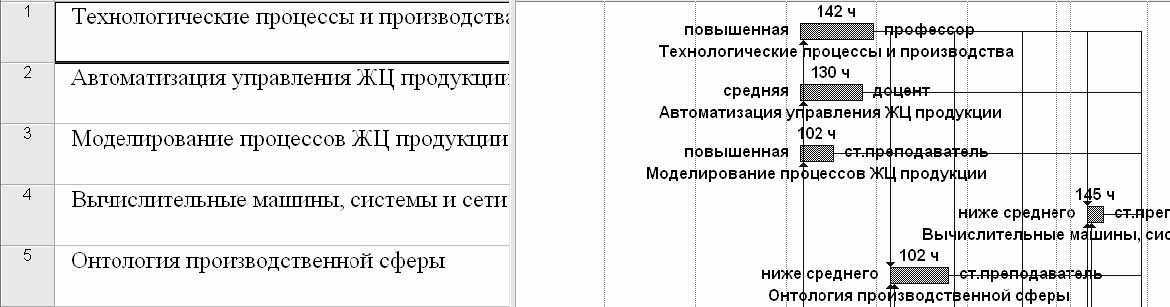 Оптимальный учебный план в Requisite Pro формируется при помощи программы Microsoft Project. Данные о дисциплинах из Requisite Pro автоматически экспортируются в Microsoft Project. На первом этапе учебный план рассматривается в виде диаграммы Ганта (Рис. 3):