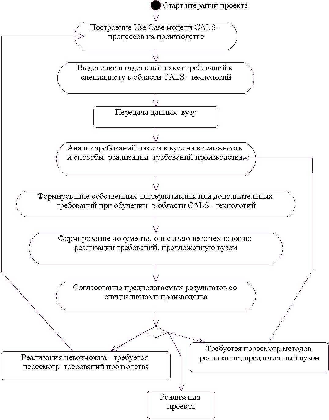 Для определенности рассмотрим проект формирования учебного плана вуза при обучении специалистов в области CALS–технологий целевым назначением для конкретного производства. Остальные взаимные требования реализуются аналогичным образом. Описание взаимодействия этапов проекта, реализующего жизненный цикл указанной задачи, проиллюстрировано на диаграмме активности UML (Рис. 1).