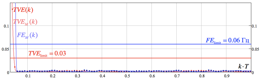 Из рис. 3 следует, что полная погрешность измерения вектора напряжения (Total vector error) и погрешность в измерении частоты (Frequency Measurement Error) значительно меньше допустимых значений.