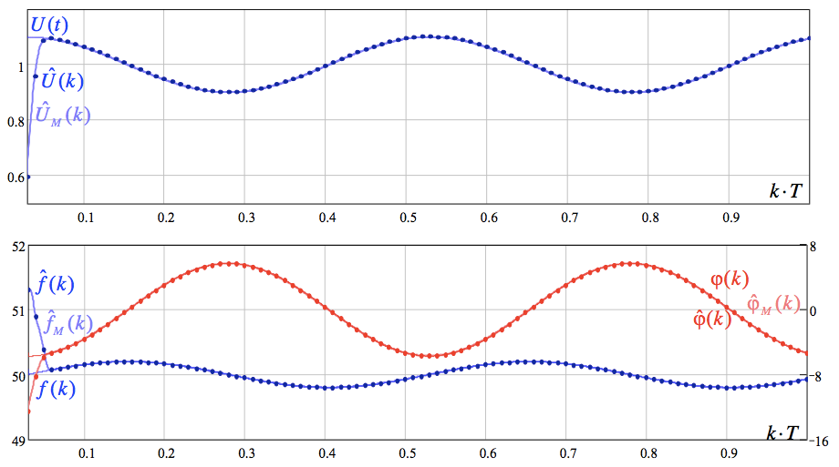 На рис. 2 представлены результаты испытаний ЭНИП-3-0 при использовании первого испытания стандарта IEEE C37.118.1 (Dynamic compliance – measurement bandwidth). На графике показаны относительное значение огибающей U(k), частота f(k) и начальная фаза phi(k) входного напряжения; U_M(k), f_M(k), phi_M(k) – результаты, полученные в результате математического моделирования, U(k), f(k), phi(k) – результаты измерений с помощью ЭНИП-3-0. Передача векторных измерений производится 100 раз в секунду.