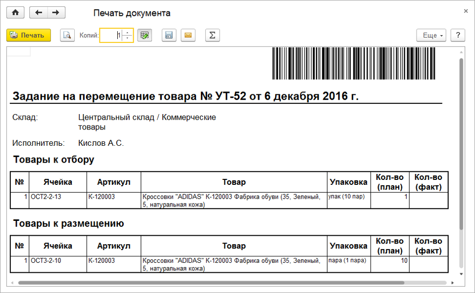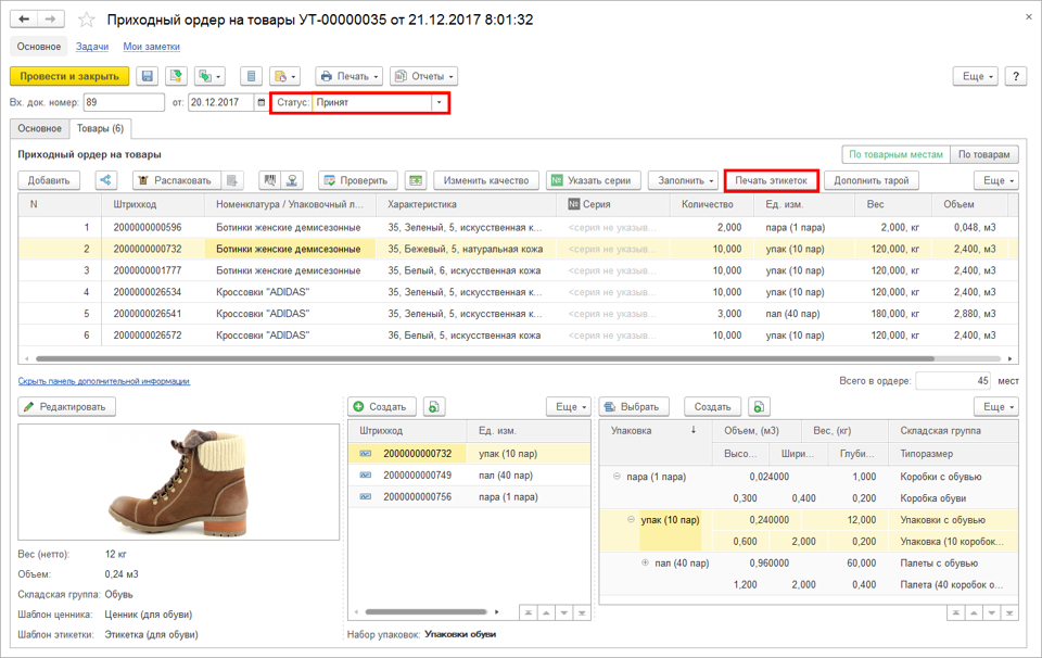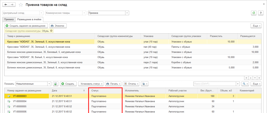 Ориентируясь на товары из такого ордера кладовщик обязан сформировать «Отбор (размещение) товаров». Система сама в автоматическом режиме выбирает ячейки, куда следует разметить товар после его прибытия на склад. При этом она ориентируется на те параметры, которые изначально задал оператор при предварительных настройках. Кладовщик берет в работу документы вполне последовательно. Также они у него меняют статус до самого последнего: «Выполнено без ошибок».