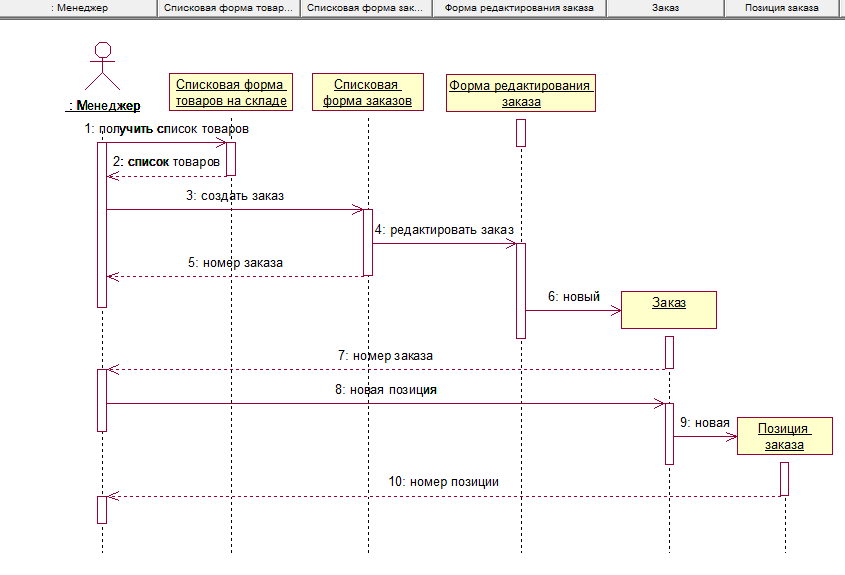 Диаграмма последовательности Менеджера для прецедента «Формирует заказ поставщику» показана на рис. 15.