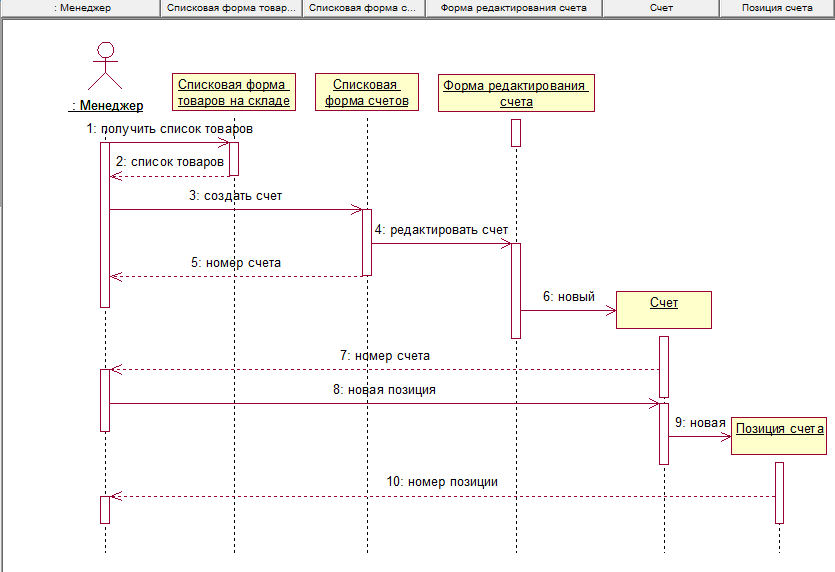 Диаграмма последовательности Менеджера для прецедента «Формирует счет на оплату» показана на рис. 11.