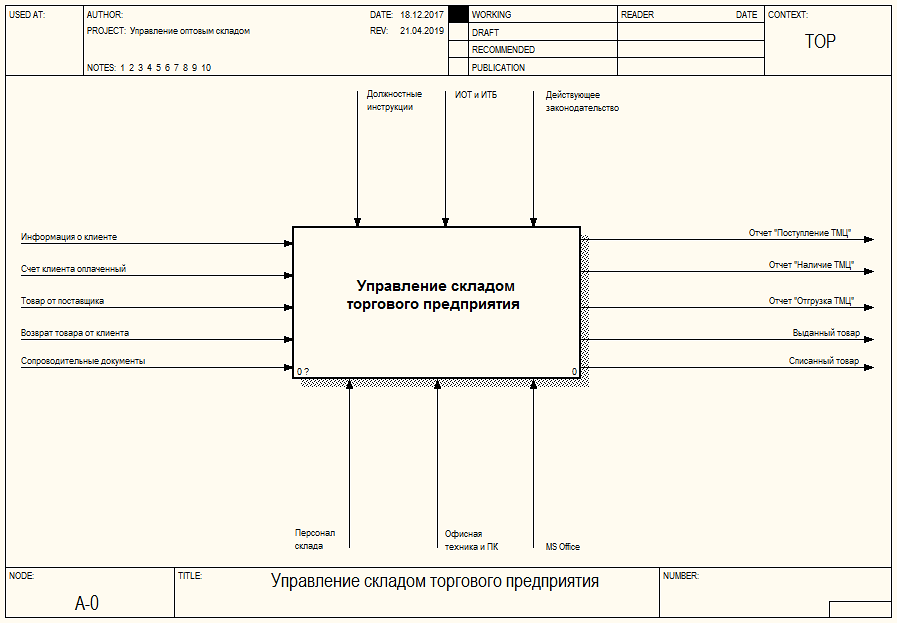 Поскольку, в рамках данной курсовой работы мы рассматриваем единичный бизнес-процесс «Управление складом», функциональную диаграмму построим для персонала склада. Контекстная диаграмма бизнес-процесса «Управление складом» в нотации IDEF0 показана на рис. 3.