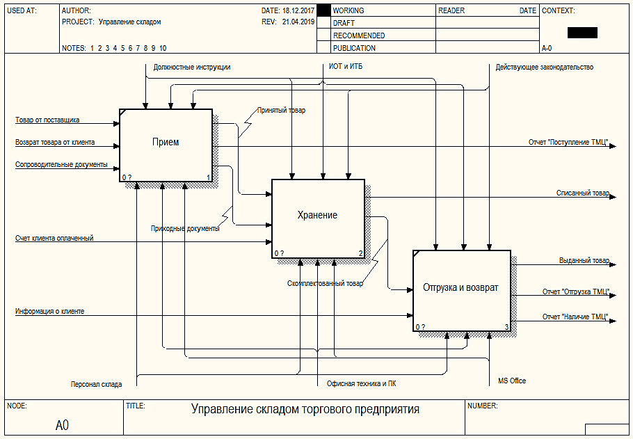 Рассмотрим функциональную модель бизнес-процессов управления складом в нотации IDEF0. Данная модель позволяет разобраться с текущей ситуацией и выяснить целесообразность существующей на предприятии организационной структуры, четко определить функции подразделений, понять, кто за них отвечает, с какой эффективность выполняется работа и т.п.