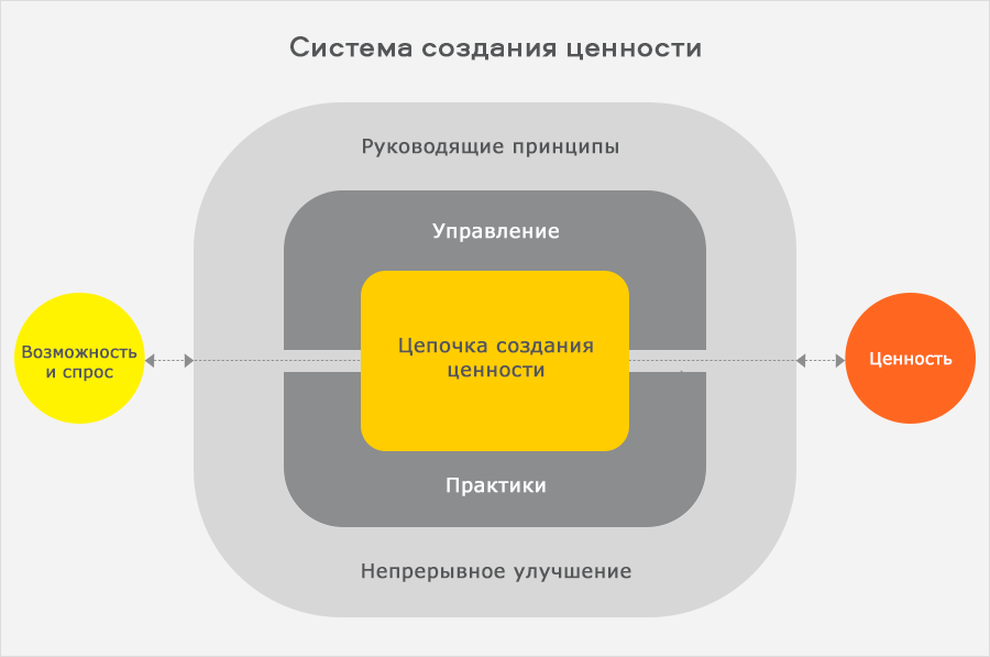 Применение практик теперь основывается на цепочке создания ценности услуги. Ее смысл заключается в трансформации спроса (Demand) в продукты и услуги (Products & services) и их ценность (Value). В цепочку включены 6 активностей: