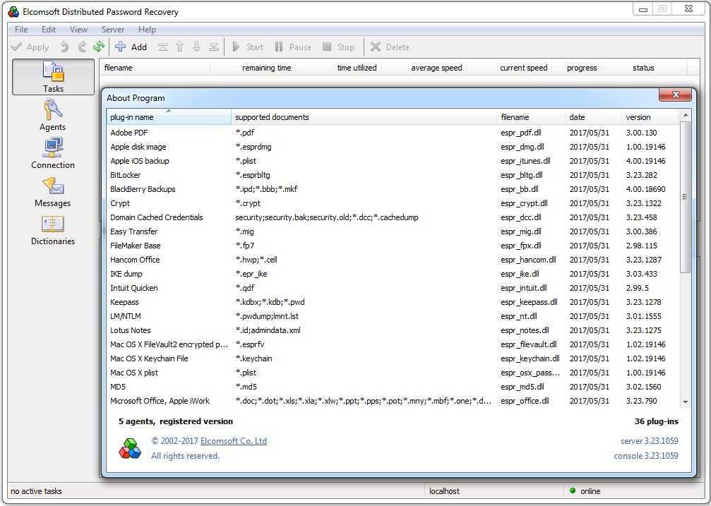 Наверняка ты уже сталкивался с продуктами компании Elcomsoft. Помню, еще в начале нулевых я тестировал их первые «отмычки» для документов формата Microsoft Office, разных архивов и все думал, когда они выпустят универсальную программу. Ее появление не заставило долго ждать. Поначалу Elcomsoft Distributed Password Recovery (EDPR) просто вобрала в себя прежние наработки, но уже с 2008 года получила самостоятельное развитие. Тогда в нее добавили поддержку GPGPU и постепенно интегрировали все новые плагины, оптимизированные для использования видеокарт в брутфорсе. Последняя (на момент обзора) версия 3.23.1059 содержит 36 плагинов, знает около семидесяти форматов зашифрованных файлов и работает практически в любой версии Windows.