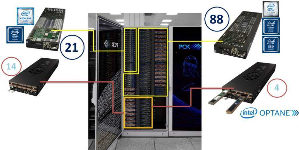 - Intel SSD DC S4510(SATA, M.2),2x Intel SSD DC P4511 (NVMe, M.2) 2TB / 4x Intel (PMem) 450 GB