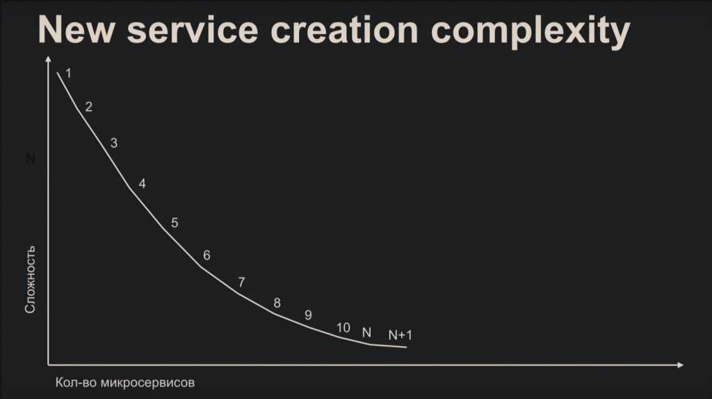 После прочитанного вы вряд ли посчитаете микросервисную архитектуру лёгким делом, но это распространённое заблуждение. Сложность создания микросервиса наглядно показывает график: