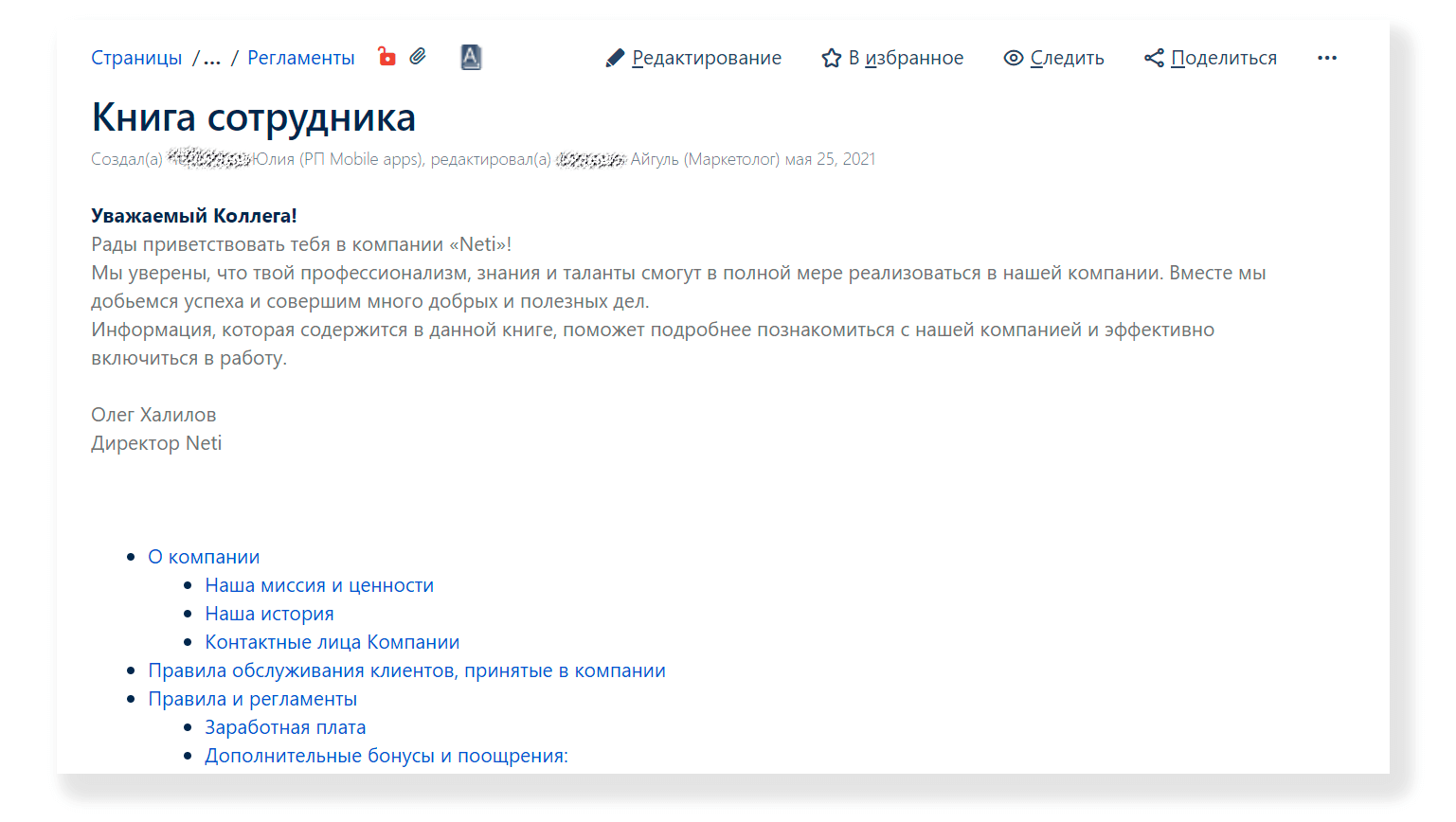 Основной материал, который изучает новый разработчик 1С в первый день — это Книга сотрудника. Из нее можно узнать историю, миссию, ценности и правила Neti. Также там хранятся ответы на вопросы, которые часто появляются у новичков: