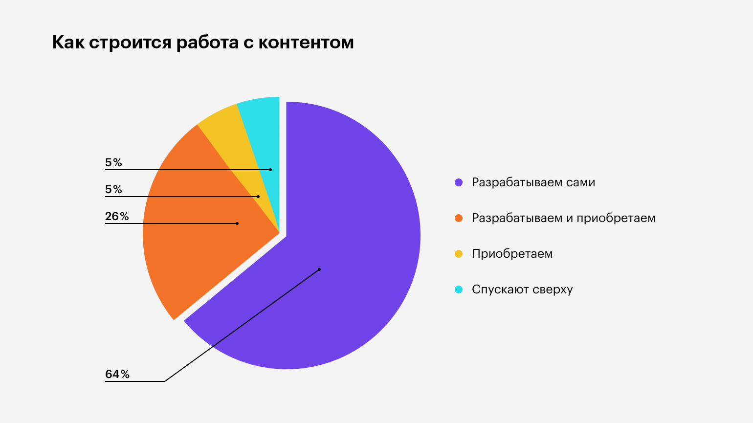 Разработка собственных курсов предсказуемо ложится на плечи отделов внутреннего обучения: только 26% привлекают к этому сторонних подрядчиков, а вот 64% самостоятельно создают программы и контент для них.