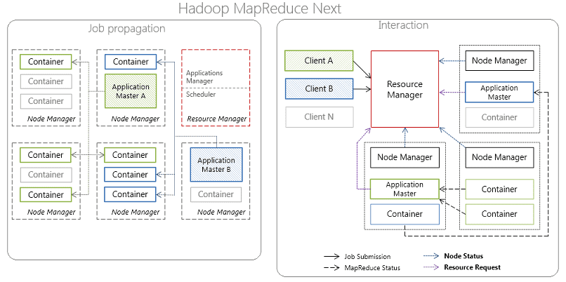 Эти ограничения были устранены в новой версии MapReduce 2.0, выпущенной в 2012 году, за счет изменений в менеджере ресурсов (ResourceManager) и планировщике-координаторе приложений ApplicationMaster, а также появления YARN (Yet Another Resource Negotiator). Этот программный фреймворк выполнения распределенных приложений предоставляет компоненты и API для разработки распределенных приложений различных типов, обеспечивая распределение ресурсов в ответ на запросы от выполняемых приложений и ответственность за отслеживанием статуса их выполнения .