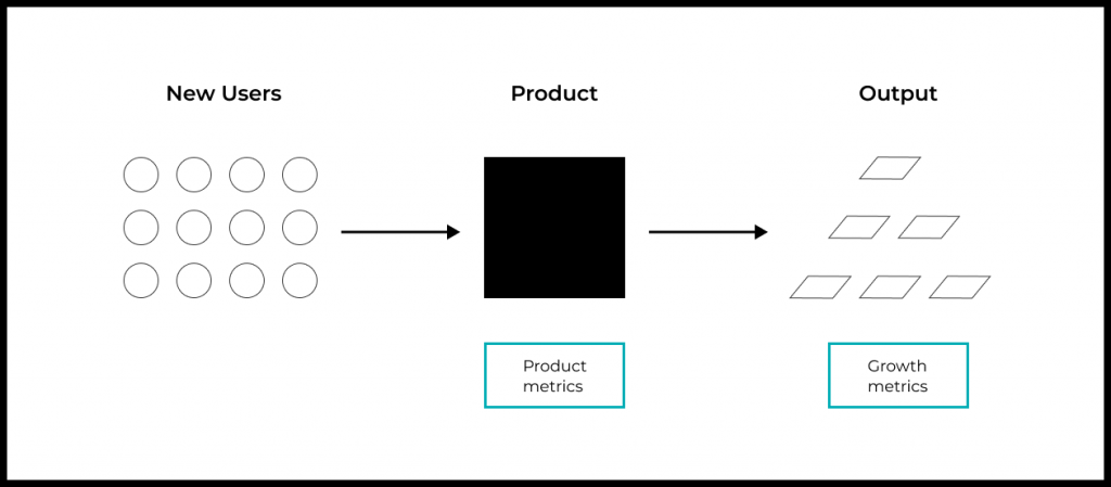 Любой продукт можно рассматривать как магическую черную коробку, к которой пользователи обращаются для решения своих задач. На вход этой коробки подаются новые пользователи. Продукт их перерабатывает и превращает в активных пользователей, прибыль, запросы в службу поддержки и так далее.