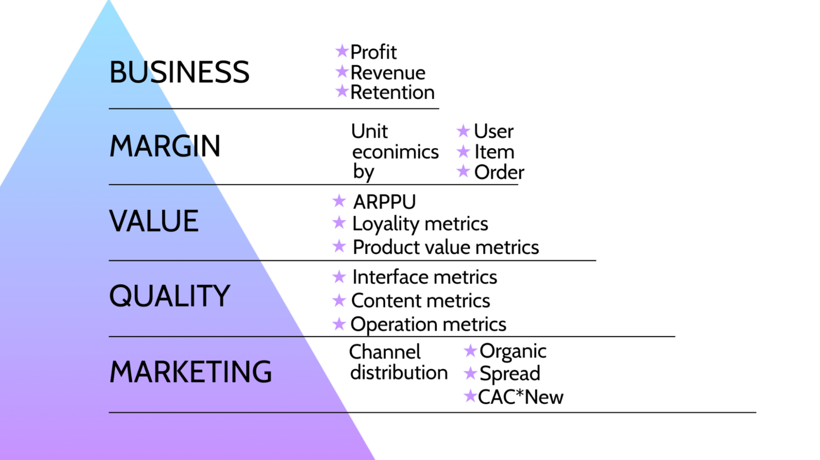 - В основе находятся бизнес-метрики, которые показывают, зарабатываем ли мы и эффективна ли наша бизнес-модель (считаем общий профит).