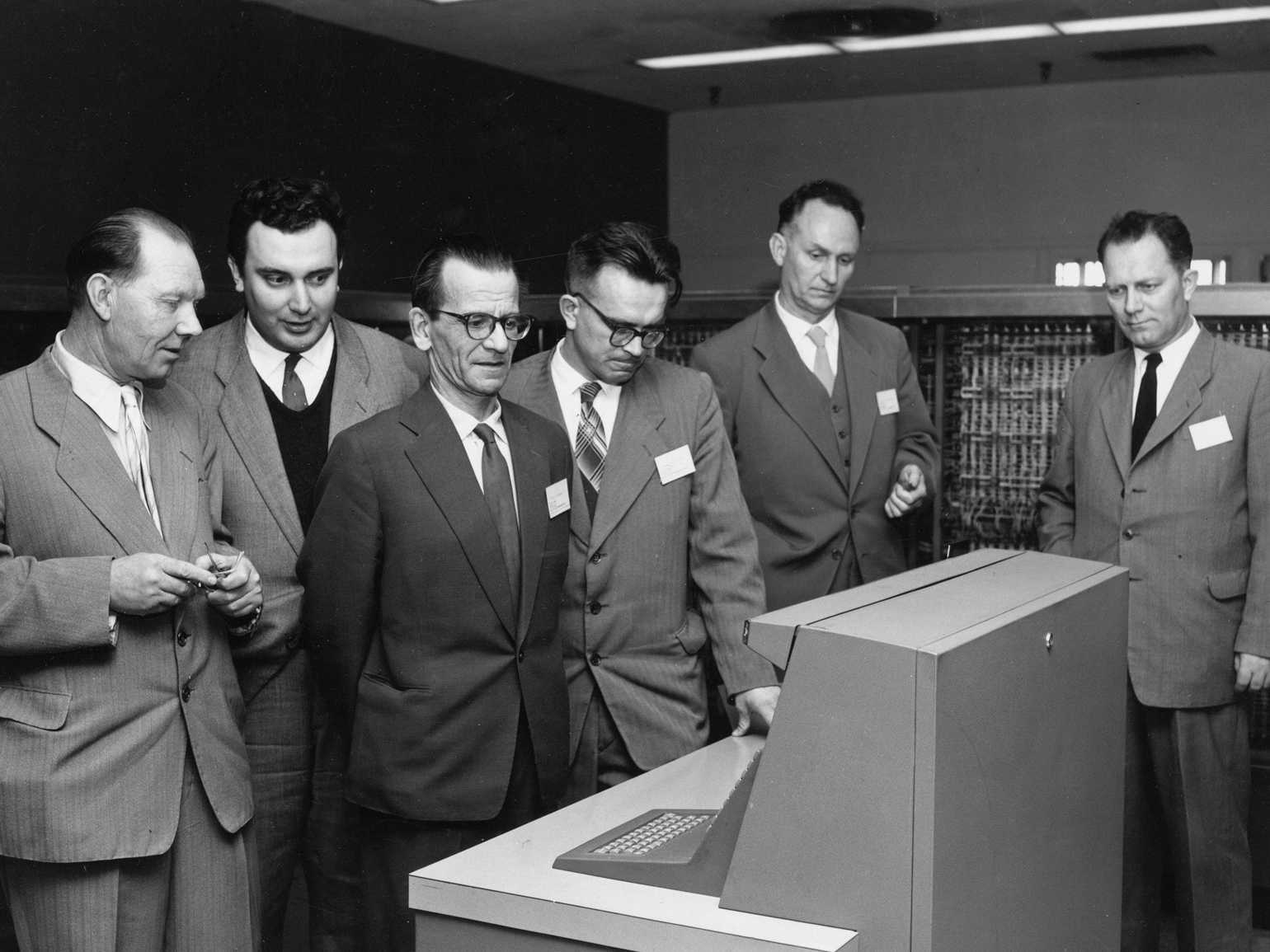 Сергей Лебедев с коллегами знакомятся с компьютерами IBM, апрель-май 1959 годаФото: «История информационных технологий в СССР и России»