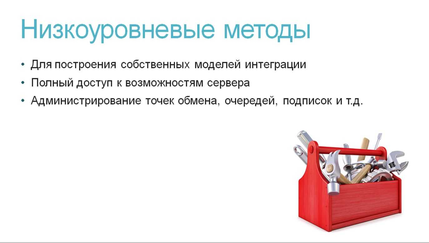 Как я уже говорил, в компоненте есть низкоуровневые методы. Если вам недостаточно высокоуровневых абстракций, вы можете построить свои собственные паттерны, используя AMQP в чистом виде.