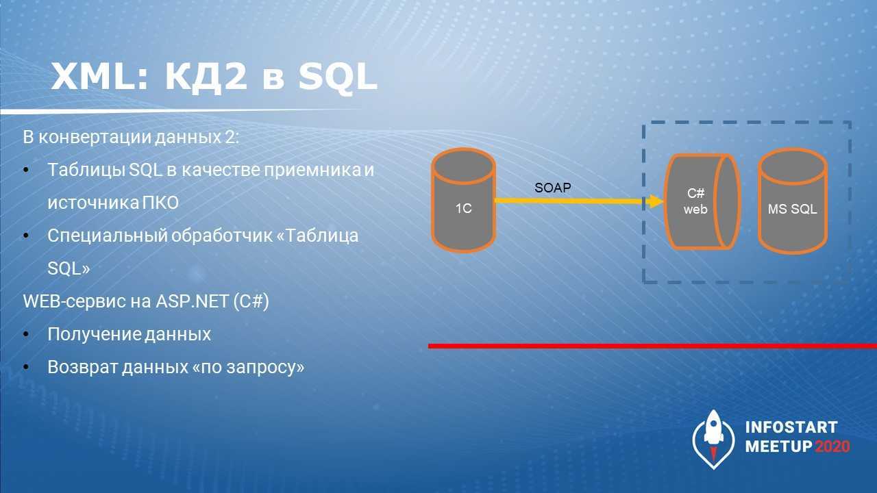 И написал на С# веб-сервис, который получает данные от 1С и, опираясь на правила КД2, раскладывает эти данные в таблицу SQL.