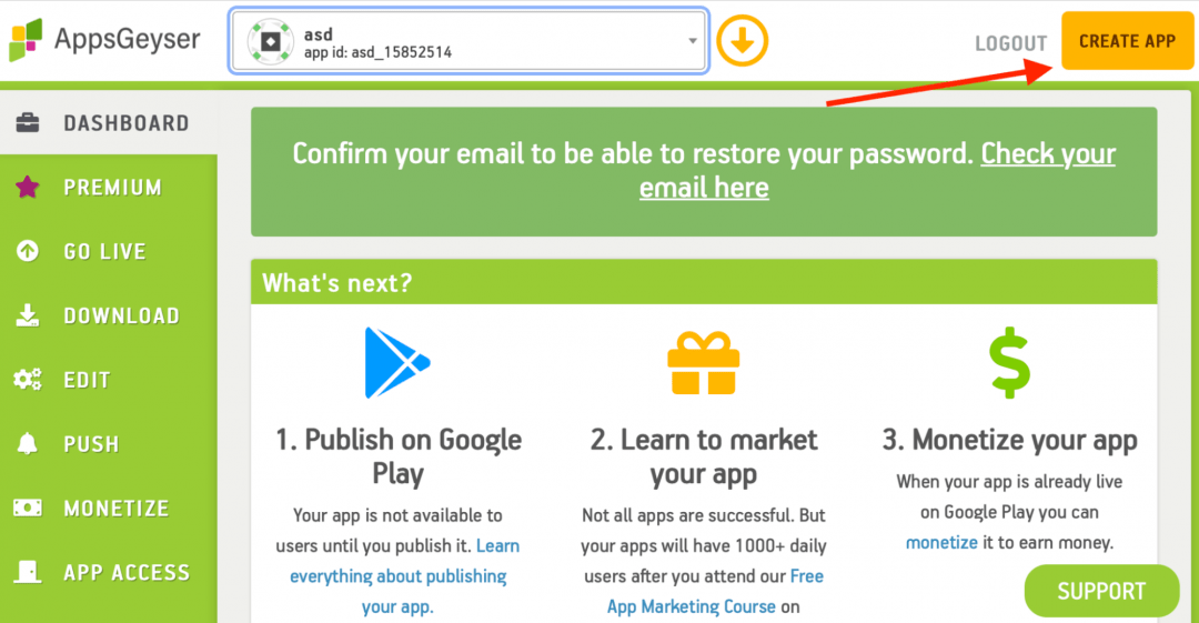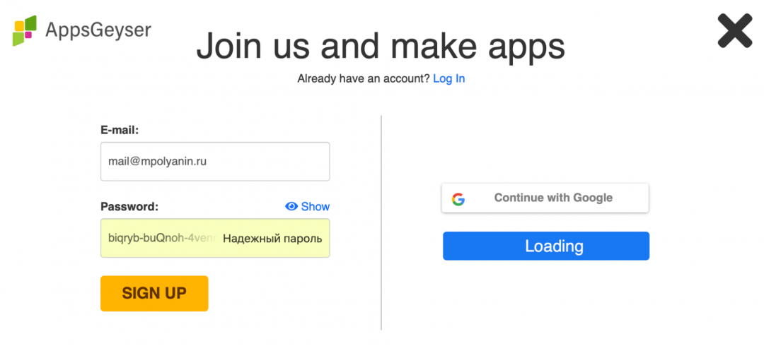 Мы будем пользоваться бесплатным конструктором AppGeyser — у него устаревший интерфейс, но он работает и делает всё, что нам нужно. У бесплатной версии есть два больших минуса: приложение иногда будет показывать какую-то свою рекламу и его нельзя будет опубликовать в Google Play. Если мы хотим просто попробовать — это не критично, а если будет нужно, то всегда можно купить полную версию.Заходим на главную страницу сервиса и нажимаем Login для регистрации — без этого сервис не отдаст нам готовый файл. Дальше всё стандартно: вводим свою почту, придумываем пароль и нажимаем кнопку Sign up: