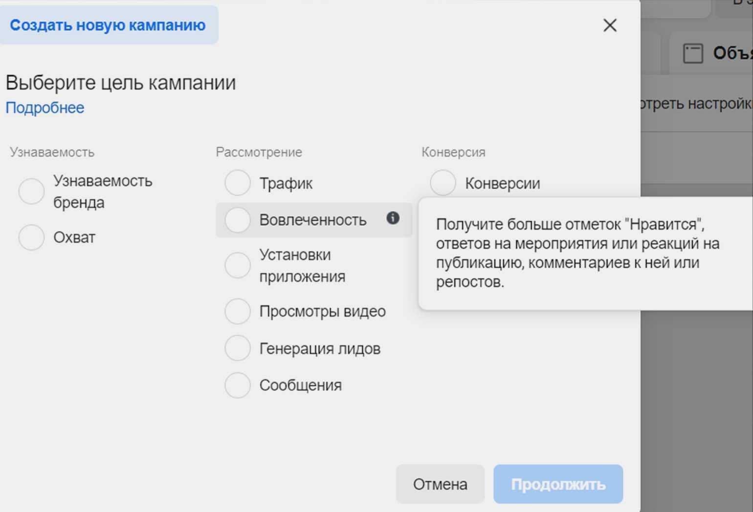 Например в Facebook* Ads Manager можно быстро разобраться с непонятными целями рекламы и установить нужную. Скриншот: Skillbox