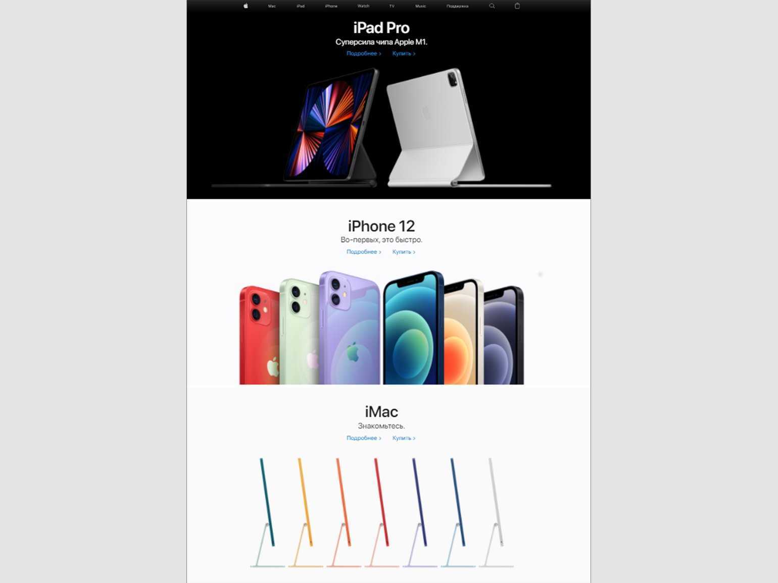 Лучше всего этот принцип демонстрирует сайт Apple: информацию о товаре здесь не вываливают сразу. Для начала дают впечатлиться визуальной частью, а дальше перенаправляют на более информативные страницы, где про каждый продукт рассказывают подробнее. Скриншот: Skillbox
