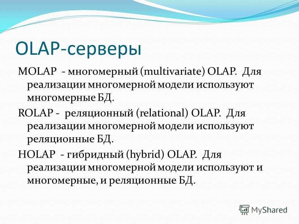 OLAP-серверы MOLAP — многомерный (multivаriаtе) ОLАР. Для реализации многомерной модели используют многомерные БД. ROLAP — реляционный (relаtiоnаl) OLAP. Для реализации многомерной модели используют реляционные БД. HOLAP — гибридный (hybrid) OLAP. Для реализации многомерной модели используют и многомерные, и реляционные БД.