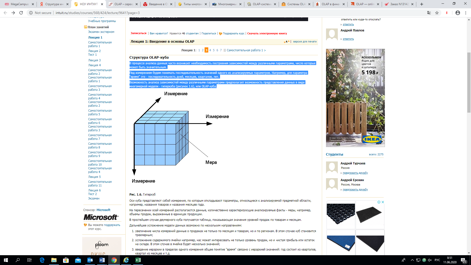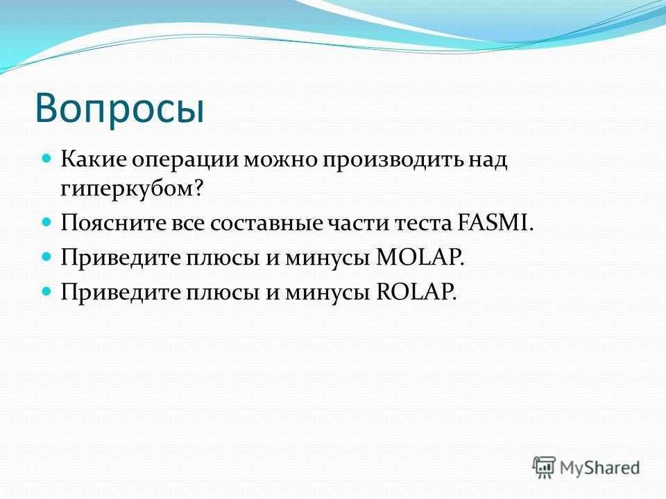 Вопросы Какие операции можно производить над гиперкубом? Поясните все составные части теста FASMI. Приведите плюсы и минусы MOLAP. Приведите плюсы и минусы ROLAP.
