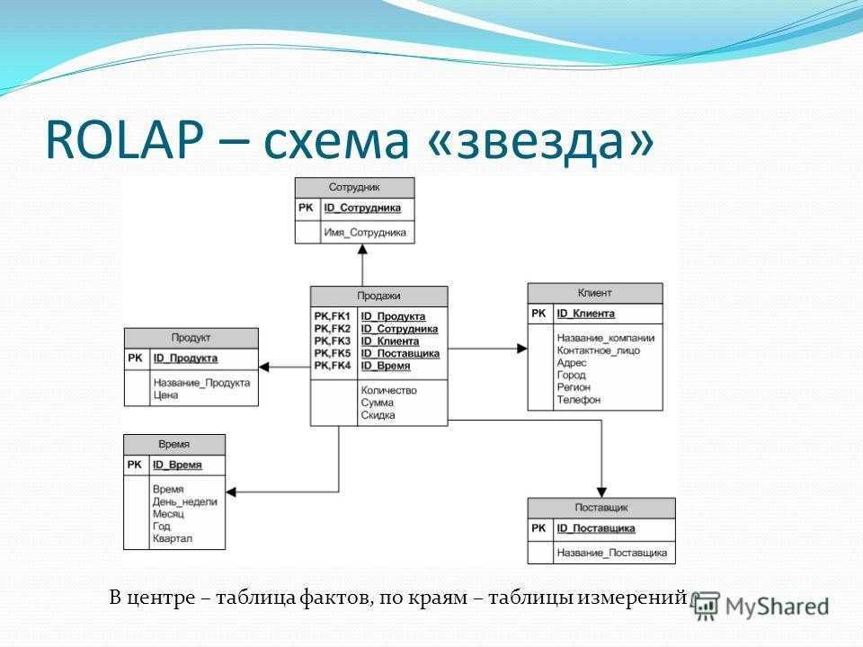 ROLAP – схема «звезда» В центре – таблица фактов, по краям – таблицы измерений