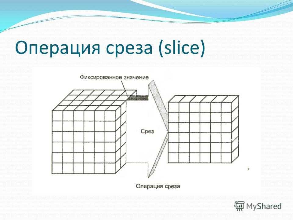 - Срез (рисунок 2) — формируется подмножество многомерного массива данных, соответствующее единственному значению одного или нескольких элементов измерений, не входящих в это подмножество.