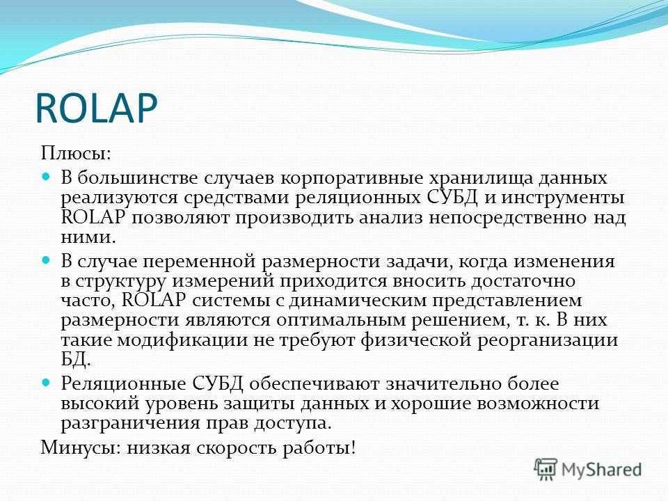 ROLAP Плюсы: В большинстве случаев корпоративные хранилища данных реализуются средствами реляционных СУБД и инструменты ROLAP позволяют производить анализ непосредственно над ними. В случае переменной размерности задачи, когда изменения в структуру измерений приходится вносить достаточно часто, RОLАР системы с динамическим представлением размерности являются оптимальным решением, т. к. В них такие модификации не требуют физической реорганизации БД. Реляционные СУБД обеспечивают значительно более высокий уровень защиты данных и хорошие возможности разграничения прав доступа. Минусы: низкая скорость работы!