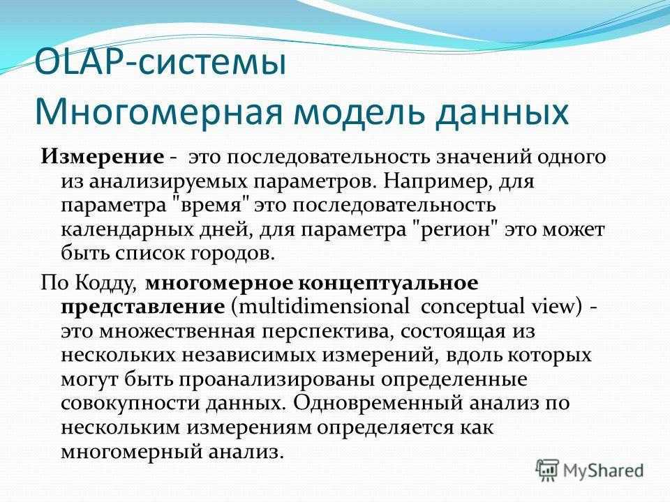 ОLАР-системы Многомерная модель данных Измерение — это последовательность значений одного из анализируемых параметров. Например, для параметра «время» это последовательность календарных дней, для параметра «реrион» это может быть список городов. По Кодду, многомерное концептуальное представление (multidimensional conceptual view) — это множественная перспектива, состоящая из нескольких независимых измерений, вдоль которых могут быть проанализированы определенные совокупности данных. Одновременный анализ по нескольким измерениям определяется как многомерный анализ.