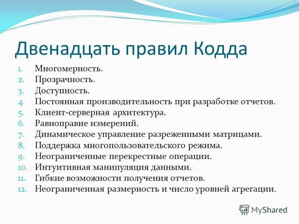 Двенадцать правил Кодда 1. Многомерность. 2. Прозрачность. 3. Доступность. 4. Постоянная производительность при разработке отчетов. 5. Клиент-серверная архитектура. 6. Равноправие измерений. 7. Динамическое управление разреженными матрицами. 8. Поддержка многопользовательского режима. 9. Неограниченные перекрестные операции. 10. Интуитивная манипуляция данными. 11. Гибкие возможности получения отчетов. 12. Неограниченная размерность и число уровней агрегации.