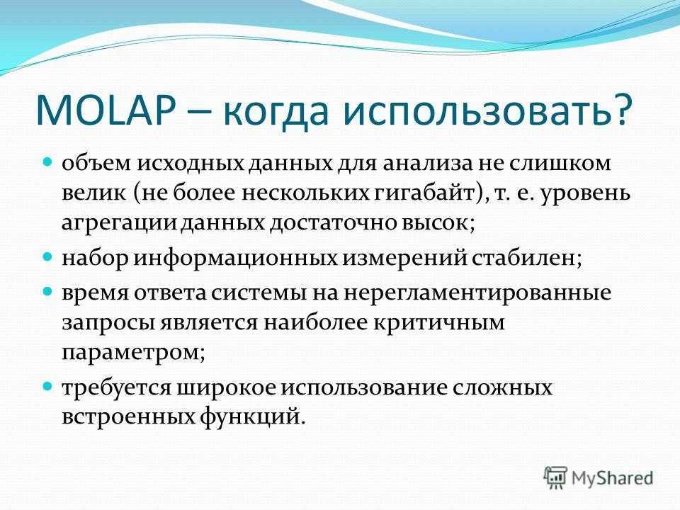 MOLAP – когда использовать? объем исходных данных для анализа не слишком велик (не более нескольких гигабайт), т. е. уровень агрегации данных достаточно высок; набор информационных измерений стабилен; время ответа системы на нерегламентированные запросы является наиболее критичным параметром; требуется широкое использование сложных встроенных функций.