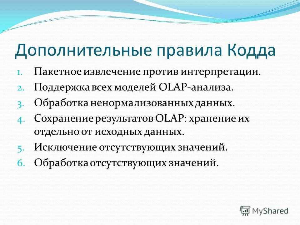 Дополнительные правила Кодда 1. Пакетное извлечение против интерпретации. 2. Поддержка всех моделей ОLАР-анализа. 3. Обработка ненормализованных данных. 4. Сохранение результатов OLAP: хранение их отдельно от исходных данных. 5. Исключение отсутствующих значений. 6. Обработка отсутствующих значений.