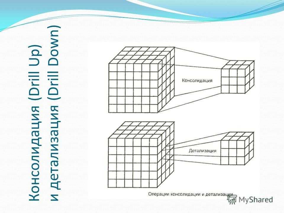 - Консолидация (рисунок 4) и детализация (рисунок 5) — операции, которые определяют переход вверх по направлению от детального представления данных к агрегированному и наоборот, соответственно. Направление детализации (обобщения) может быть задано как по иерархии отдельных измерений, так и согласно прочим отношениям, установленным в рамках измерений или между измерениями.