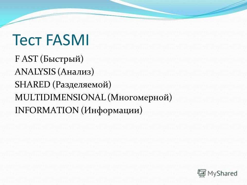 Тест FASMI F AST (Быстрый) ANALYSIS (Анализ) SHARED (Разделяемой) МULТIDIМЕNSIONАL (Mногомерной) INFORMAТION (Информации)