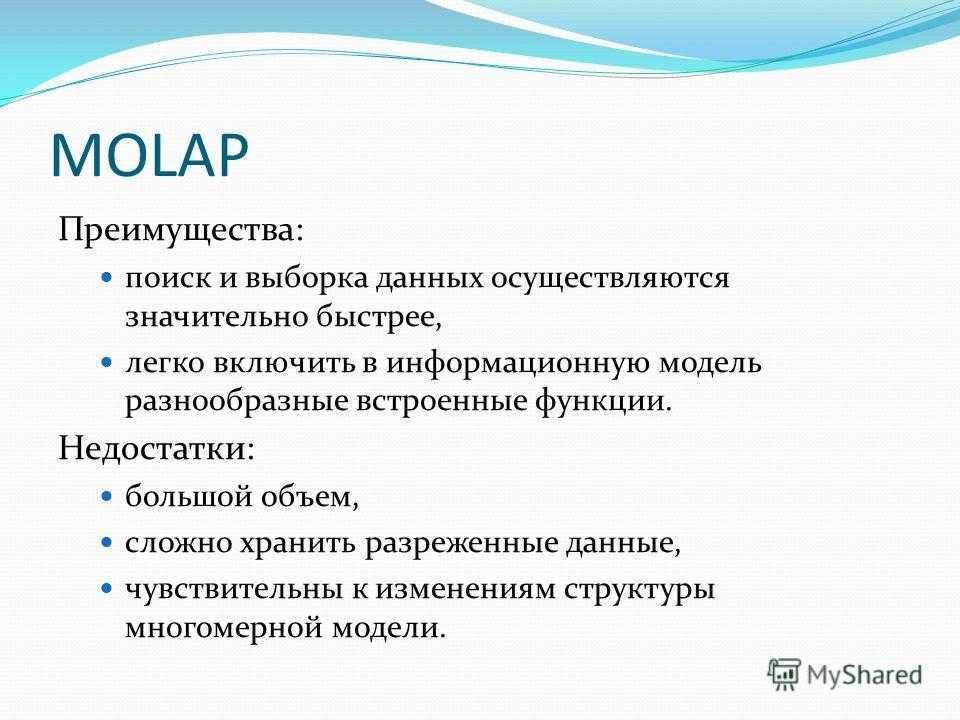 MOLAP Преимущества: поиск и выборка данных осуществляются значительно быстрее, легко включить в информационную модель разнообразные встроенные функции. Недостатки: большой объем, сложно хранить разреженные данные, чувствительны к изменениям структуры многомерной модели.