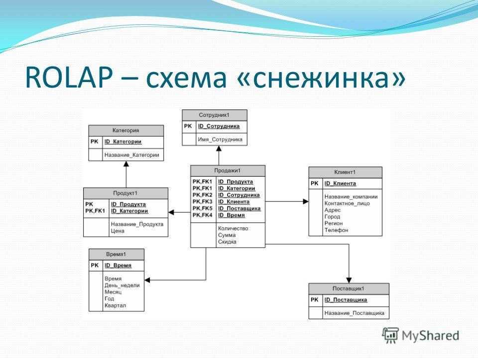 - ROLAP (Relational OLAP) — детальные данные остаются там, где они «жили» изначально — в реляционной БД; агрегаты хранятся в той же БД в специально созданных служебных таблицах.