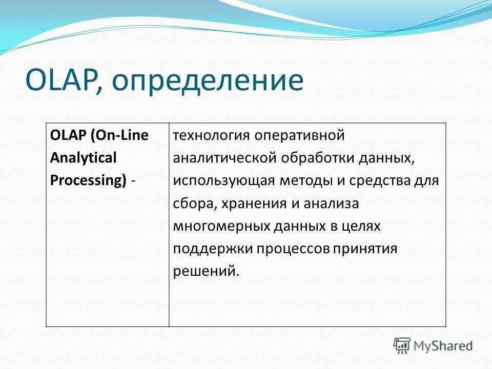 OLAP, определение OLAP (On-Line Analytical Processing) — технология оперативной аналитической обработки данных, использующая методы и средства для сбора, хранения и анализа многомерных данных в целях поддержки процессов принятия решений.
