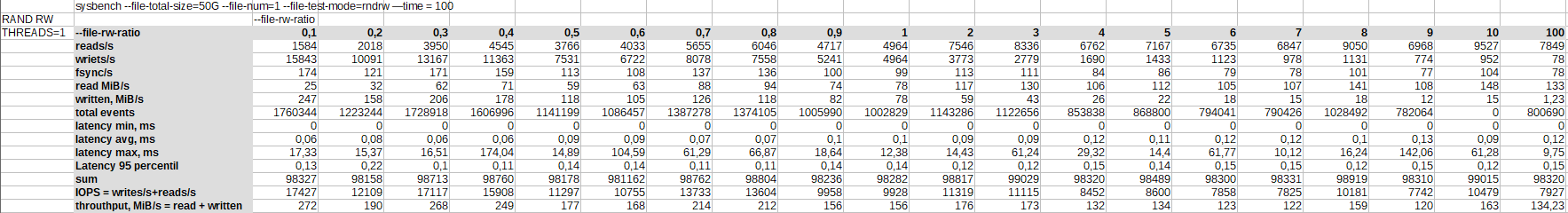 С увеличением доли чтения, падает число IOPS с 17 тыс. до 8 тыс., а пропускная способность с 270 до 120 МБ/c.