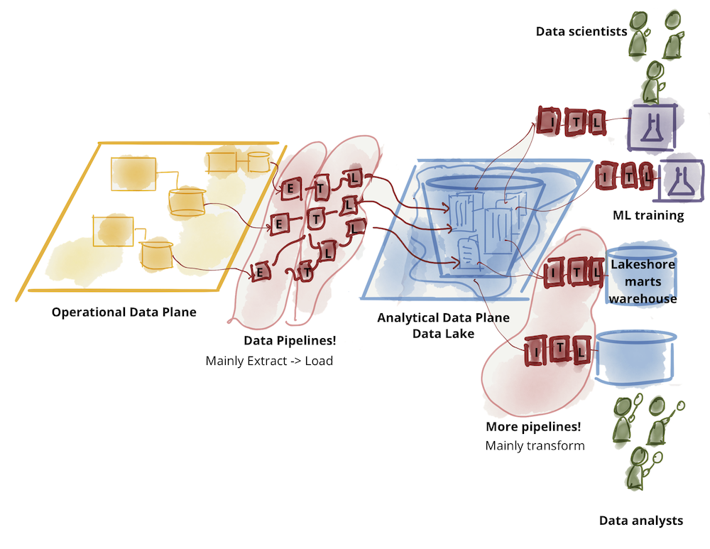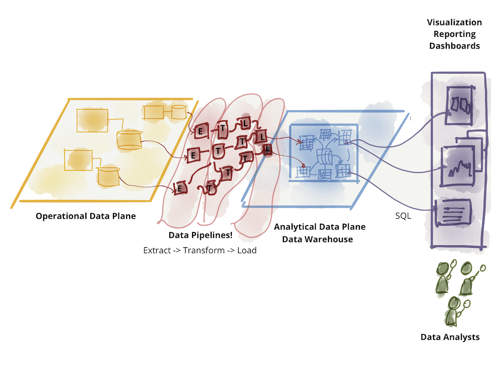 Современное состояние технологий, архитектуры и организационного дизайна отражает расхождение этих двух плоскостей данных — двух уровней существования, интегрированных, но отдельных. Это расхождение привело к хрупкой архитектуре. Постоянные сбои в заданиях ETL (Extract, Transform, Load) (извлечение, преобразование, загрузка) и постоянно растущая сложность лабиринта конвейеров данных — это знакомое зрелище для многих, кто пытается соединить эти две плоскости, передавая данные из плоскости операционных данных в аналитическую плоскость и обратно в операционную плоскость.