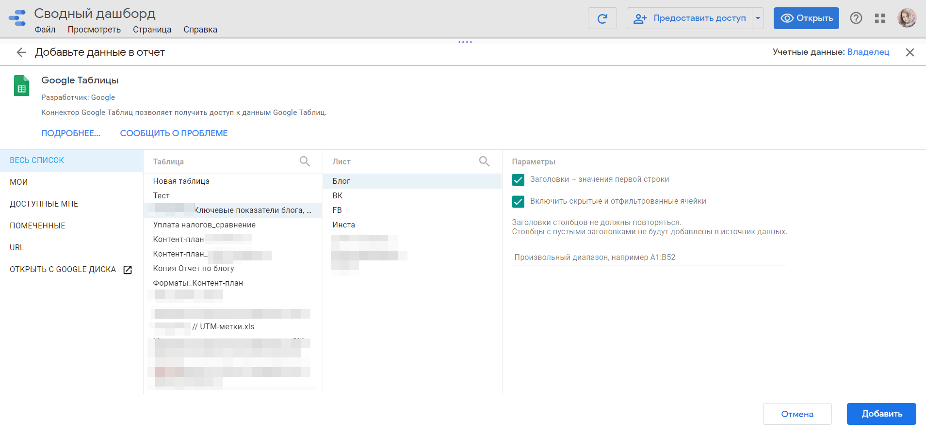 - Подключить таблицу в качестве источника к отчету в Google Looker (бывший Data Studio).