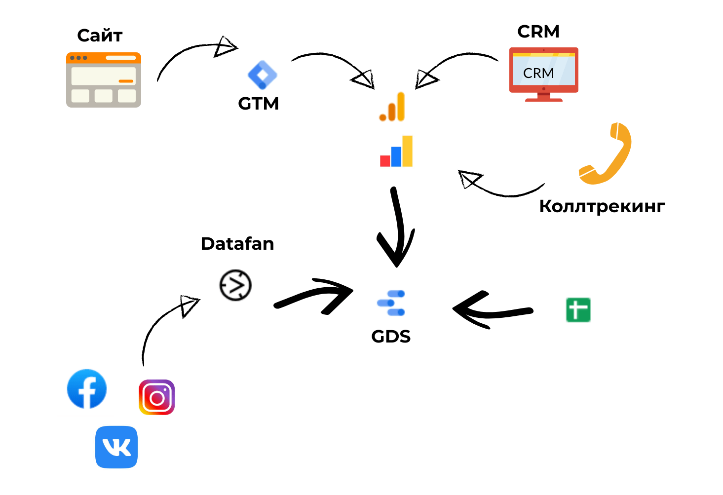 - Основную часть данных агрегируем в Google Analytics. Туда через Google Tag Manager попадают данные о визитах, макро и микроконверсиях с сайта, звонках из коллтрекинга, продажах, этапах сделок, выручке и прибыли из CRM.