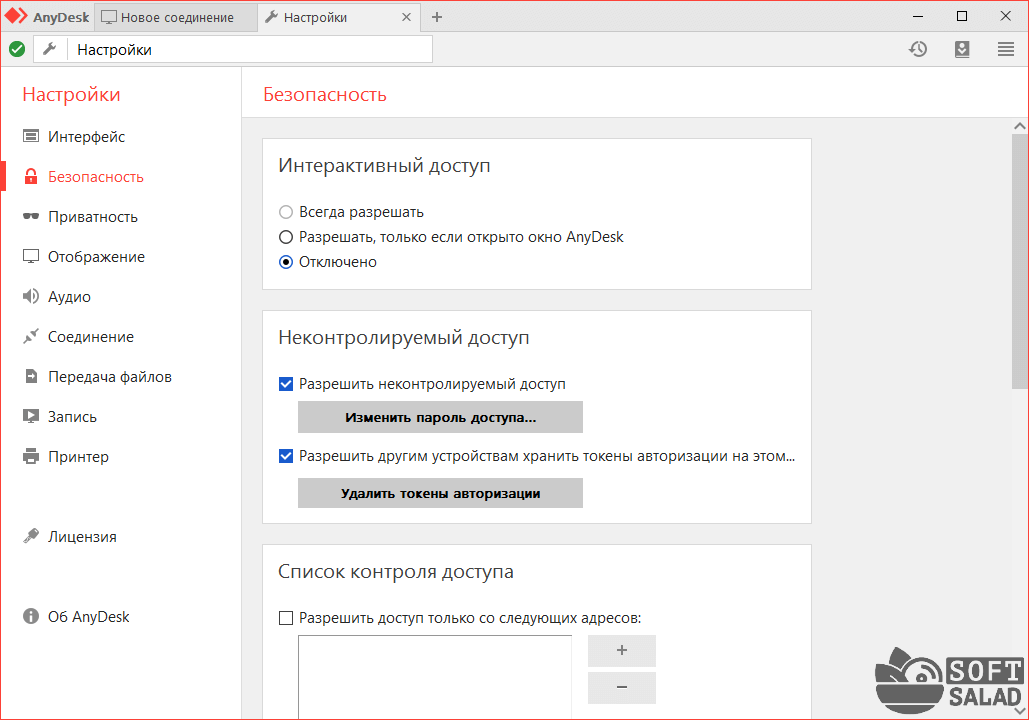 Если кликнуть по элементу «Изменить пароль доступа» в главном окне программы, откроется вкладка «Безопасность» меню настроек (но это не единственный способ открытия окна настроек). При установке переключателя в положение «Отключено» в блоке «Интерактивный доступ» программа начнет запрашивать пароль у управляющего компьютера. А сам пароль задается в блоке «Неконтролируемый доступ» при включенном параметре «Разрешить неконтролируемый доступ».