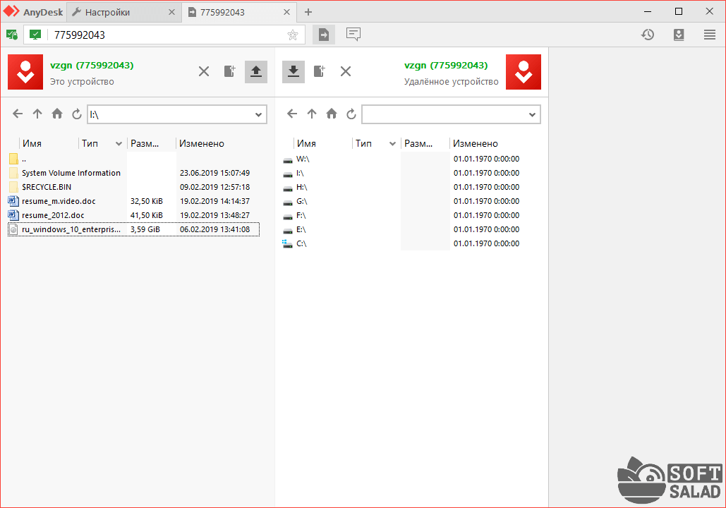 Как видно из изображения, AnyDesk может работать в двух режимах — управление и обзор файлов. При выборе второго варианта запускается двухоконный файловый менеджер на подобии Total Commander. По умолчанию доступ открыт ко всем физическим и логическим дискам удаленного компьютера.