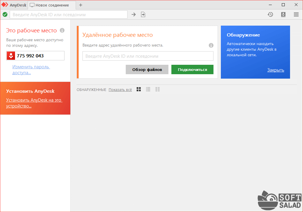 В AnyDesk реализована функция автоматического поиска компьютеров в локальной сети. Если таковые имеются, и на них установлена утилита, в центре окна программы в разделе «ОБНАРУЖЕННЫЕ» отобразится соответствующий список.