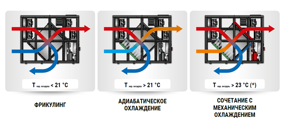 В таких условиях, использование оборудования с возможностью выхода на свободное и/или адиабатическое охлаждение при высоких температурах наружного воздуха является перспективным и интересным решением. Использование такого оборудования позволит повысить эффективность системы кондиционирования при сокращении эксплуатационных расходов.
