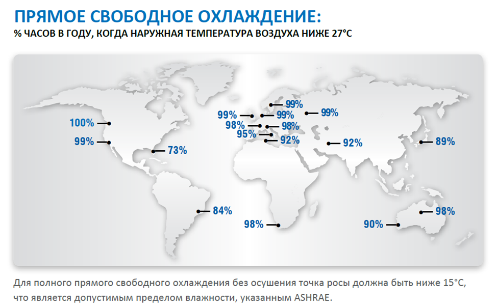 В последние годы ASHRAE увеличила температурные пределы внутри ЦОД и серверных. Все больше мест по всему миру могут достичь необходимых параметров охлаждения с применением свободного охлаждения, используя (прямо или косвенно) свежий воздух извне. Увеличилось количество часов работы оборудования в режиме свободного охлаждения, так же, как и карта стран с доступностью свободного охлаждения стала шире.