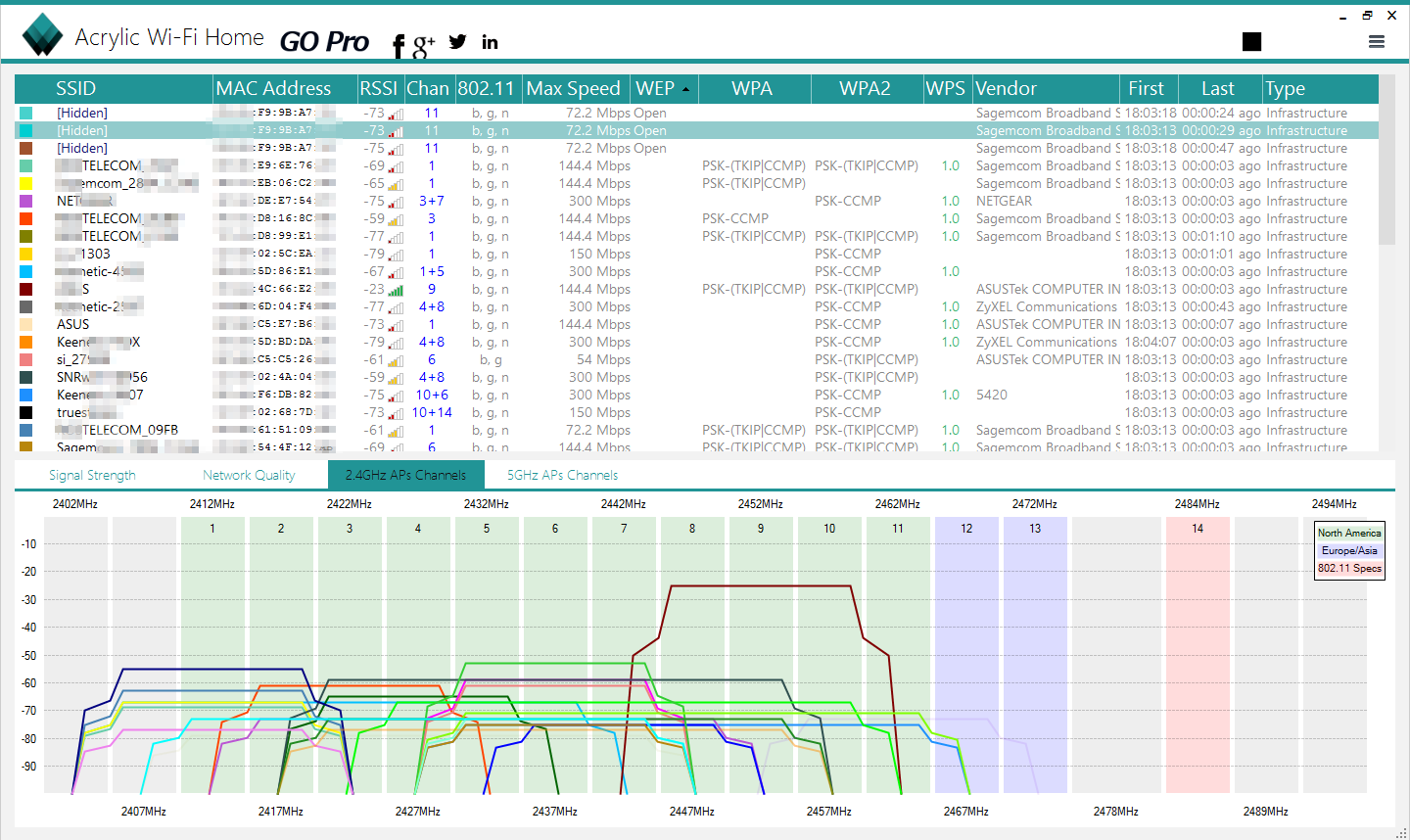 За пару минут сканирования я нашел 54 хотспота в диапазоне 2,4 ГГц, но стабильная связь возможна только с тремя из них. Более-менее ловятся еще восемь AP, а соединение с остальными возможно только при использовании направленной антенны или мощного усилителя. Моя основная точка доступа в таблице отсутствует. Дело в том, что NetSpot не показывает сети со скрытым SSID. Добавить их вручную тоже нельзя.