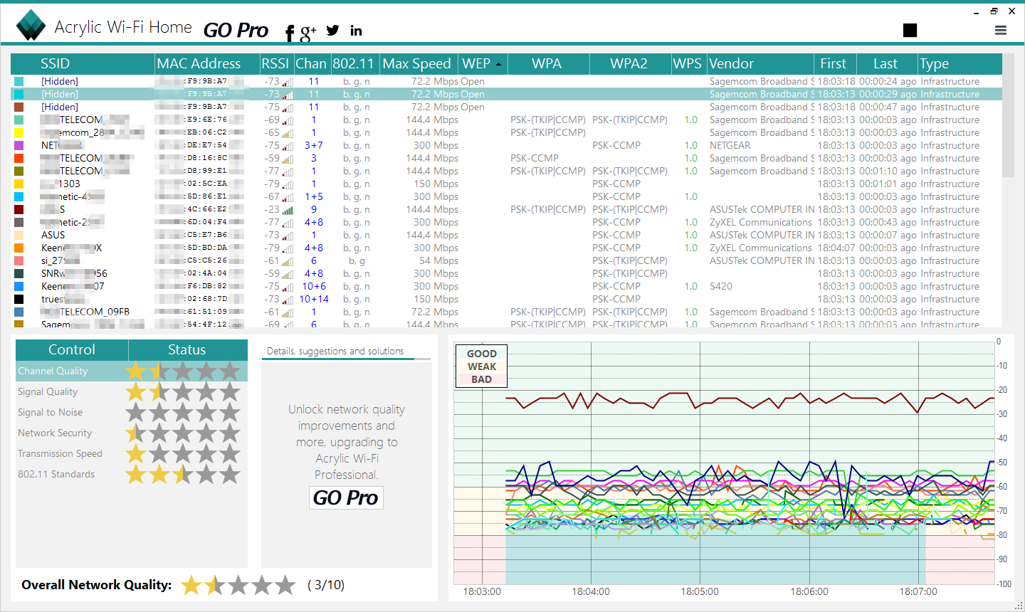 Если надо улучшить связь в одном конкретном месте, то делать карту всего помещения необязательно. Для этого у NetSpot есть мониторинг в режиме реального времени. Уже через несколько секунд после запуска можно получить представление об общей картине в эфире, а затем изучать ее более прицельно.
